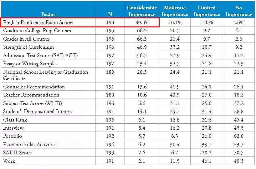 1. 英语水平考试成绩(托福、雅思): 递交反馈的193所美国大学有80.3%认为,对国际生来说,最重要的申请因素是托福/雅思分数。