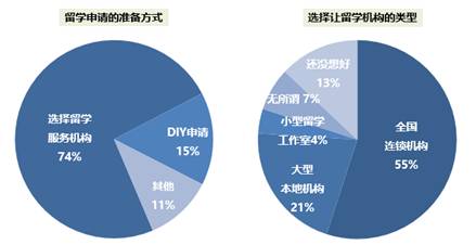 和2016年相比,留学咨询服务机构仍是计划留学人群准备留学申请的主流方式,但比例从60%上升至74%,说明越来越多的人选择专业的留学服务机构,DIY留学人群仍是少数。