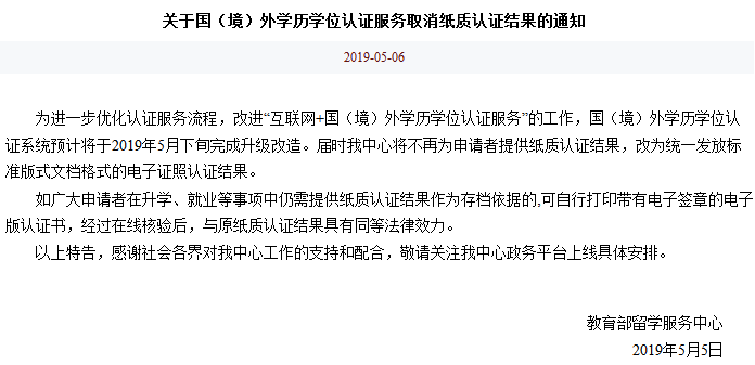 为进一步优化认证服务流程,改进“互联网+国(境)外学历学位认证服务”的工作,留服中心正在对国(境)外学历学位认证系统进行升级改造,预计将于今年的5月下旬完成。教育部留学服务中心通知:从2019年5月起,国(境)外学历认证取消纸质认证结果,统一改发电子认证。