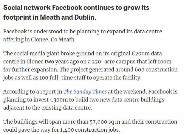 (Facebook) 在爱尔兰建立了数据中心,进一步强化了爱尔兰作为欧洲科技霸主的地位;国内科技巨头华为在爱尔兰开设了4个研发中心,主要进行核心研发任务——云技术;微软(Microsoft)和谷歌(Google)也不甘示弱,在都柏林建立了新的数据中心; 亚马逊(Amazon)在都柏林投资10亿欧元发展数据中心;T5数据公司 (T5 Data Centre)也宣布在科克成立一个投资额高达2亿欧元的数据中心。