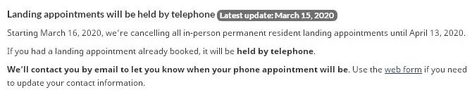 从3月16号开始,到2020年4月13日移民局取消了面对面登陆服务,改为电话登陆。请使用Web Form联系后,移民局会发信通知您电话预约报到的时间。