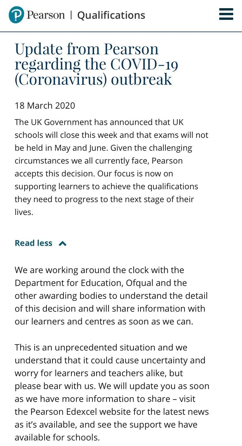 关于取消英国所有考试,特别是取消五六月的GCSE和A Level,“我完全理解这些学生的焦虑,我将确保学生的学习进度不会受到阻碍。英国政府将采取公平的措施,确保学生们拿到所需的资格证书(qualification),不会耽误学生们毕业。”