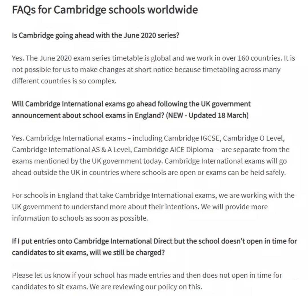 CIE考试局表示,正常开放的学校或可以安全举行考试的国家/地区,考试继续进行。也就是说,虽然英国的A Level和GCSE考试取消了,但是国内A Level和IGCSE统考照常进行,所以同学们切勿放松,继续备考!声明:本文来源于网络,版权归原作者所有。若涉及版权问题,请作者及时联系小编删除,我们会第一时间进行处理,谢谢。