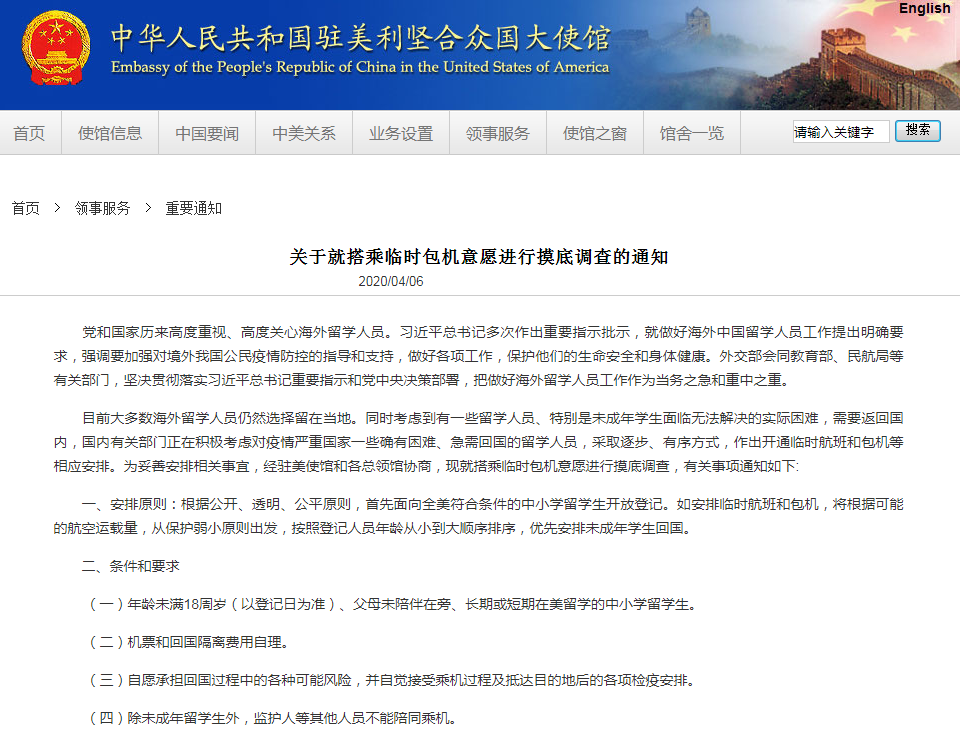 疫情之下中国驻美国大使馆网站发布公告称:目前大多数海外留学人员留在当地,考虑到有一些留学人员、特别是未成年的小留学生面临无法解决的实际困难,需要返回国内,经驻美使馆和各总领馆协商,现就搭乘临时包机意愿进行摸底调查。