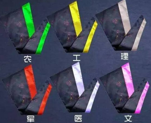 用颜色区分专业,和欧洲国家相比,美国的分类复杂多了,中国的就相对简单些,只分大类,一共有六种,粉、灰、黄、绿、白、红,分别对应六类专业:文、理、工、农、医、 军。