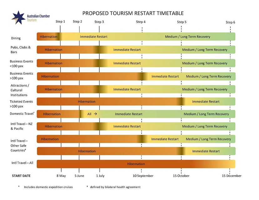 旅游业重启小组(Tourism Restart Taskforce)每周都会跟联邦政府就解封事宜进行商谈,讨论重开旅游业的计划。5月22日,小组与旅游部长Simon Birmingham的会议上,终于获批了国内旅游和活动,以及重开国际旅游的时间。