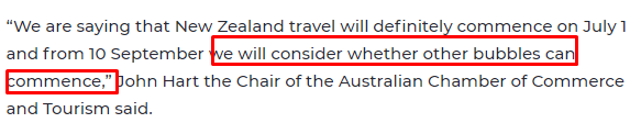 澳大利亚商会和旅游商会主席John Hart表示,澳洲肯定会在7月1日解除与新西兰的旅行限制,与此同时,政府也在考虑9月1日解封更多国家。