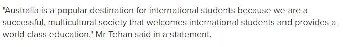 但对于这个情况,澳洲教育部长Dan Tehan出面进行了否认。他表示:“澳洲是国际学生的热门选择,因为澳洲是一个成功的多元文化社会,欢迎留学生并给他们提供一流的教育。”