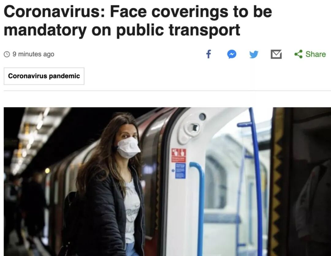 其实,早在两个月前,伦敦市长就呼吁大家出行佩戴口罩:然鹅,当时英国政府还坚持认为,没有足够证据表明戴口罩是有效的防疫措施。新冠疫情在海外爆发后,留学生因为戴口罩被攻击的新闻,也可谓是每天都占领了各大媒体的头版头条。好在,现在的英国随处可见戴口罩的民众和派发口罩的工作人员。据了解,不戴口罩的人不但会被禁止乘坐公共交通,还会被追加罚款。PS:英国政府之所以呼吁大家使用face-coverings而不是face mask,是期望普通民众尽量少用医用防护级别的口罩(PPE mask),以保证一线医务人员的口罩供应充足。从上个月开始,英国政府也向大众提供了自制面罩指南,教大家如何用纺织品来制作面罩。在当前情况下,英国政府建议市民尽可能避免乘坐公共交通工具,鼓励民众选择骑自行车或者步行出行。