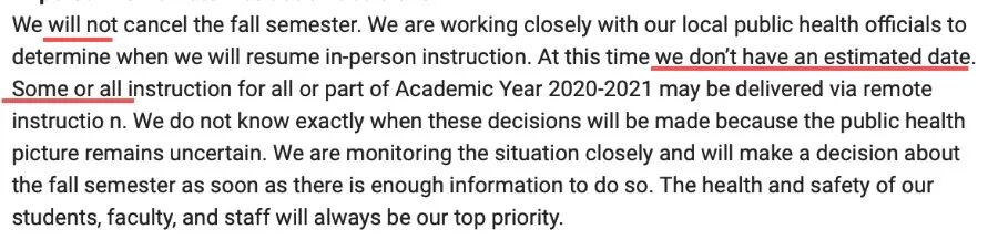 哈佛大学于周一宣布,由于新冠病毒,今年秋季只允许一年级学生和因学术原因特别邀请的本科生返回校园。这意味着,从9月份开始,只有40%的哈佛本科生会在校园里,而且所有的教学都将在远程进行。此前哈佛大学就已经宣布,它的许多研究生项目将在秋季学期进行网课远程教学。那么,无法返回校园学习,只能通过网课学习的同学们所交的学费情况如何呢?哈佛大学计划将其学年学费保持在49,650美元不变,不过根据哈佛大学同时表示,很多学生都得到了不同形式的经济自主,降低了实际学费。那些在哈佛大学接受经济资助同时进行远程学习的学生每学期将获得5000美元的津贴。加州州立大学(California State University,简称CSU)校长蒂莫西·怀特Timothy White本周二宣布,该校23座校区将在今年秋季学期继续关闭,并计划取消秋季大部分的面授课程,将主要改为网络授课。UC Berkeley的学生曾在4月收到学校的邮件。邮件中学校分享了一些关于2020年秋季学期的课程安排计划。并且该学校的课程极有可能改为全部线上或部分线上教学。如今美国移民局颁布的最新禁令,使得美国各个高校必须调整自己的教学计划步调,小编对此也表示有点无力,只能给出一些建议希望可以帮到大家希望留学生们能够顶住压力,及时调整,乘风破浪!