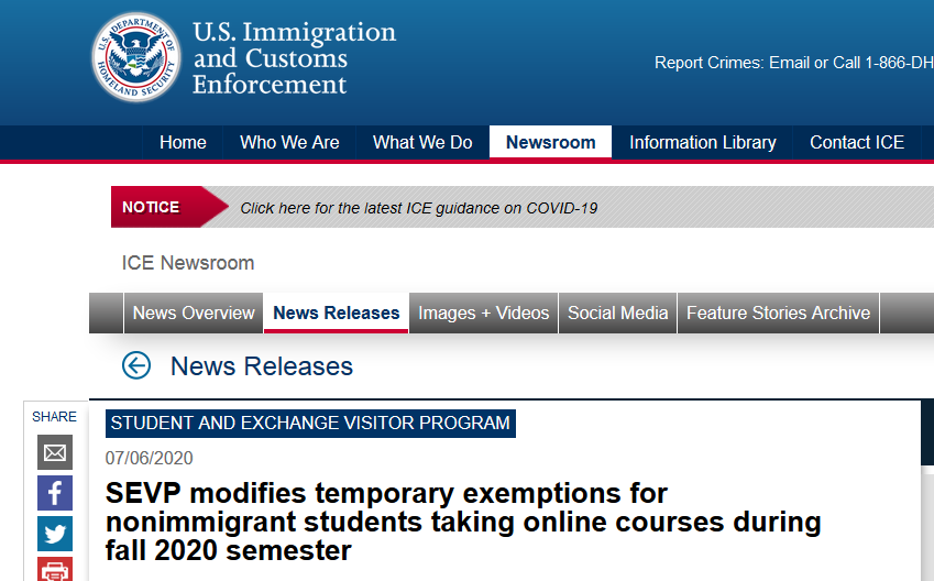 移民和海关执法局(ICE)周一宣布,在美国攻读学位的国际学生如果他们的大学转为在线授课,则将不得不离开美国或面临被驱逐出境的危险。曾经,为了应对新冠病毒在美国的大流行,学生和交流访问者项目(SEVP)允许外国学生留在美国通过网课学习2020年春季和夏季的课程。正当人们想当然的认为美国移民局将在2020年秋季沿用此前的政策,美国各高校也在商量准备着新学期的授课计划时:据美国移民和海关执法局说:持非移民F-1和M-1签证的国际学生如果全部在网上学习,就不能继续留在美国,也不能合法进入美国。