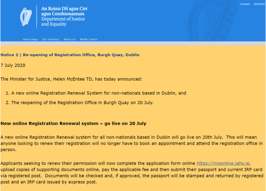 7月20日起,移民局将为在都柏林地区的外国人提供一个新的在线注册更新系统。这意味着任何想要续签的人都不再需要预约并亲自去注册处。续签者以后可以家中完成这些申请,取代了过去的复杂流程,即先完成网上填写申请表预约,在线上传文件并支付费用,然后通过邮局将护照和IRP邮寄到移民局。