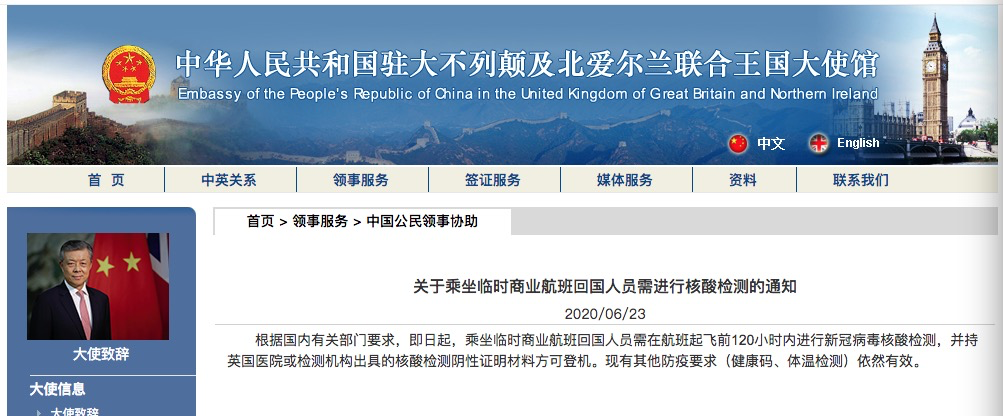 昨日,民航局、海关总署、外交部发布了关于来华航班乘客凭新冠病毒核酸检测阴性证明登机的公告与6月23日驻英国使馆发布通知内容相同,所以在驻英国使馆官方网页暂时未有更新。
