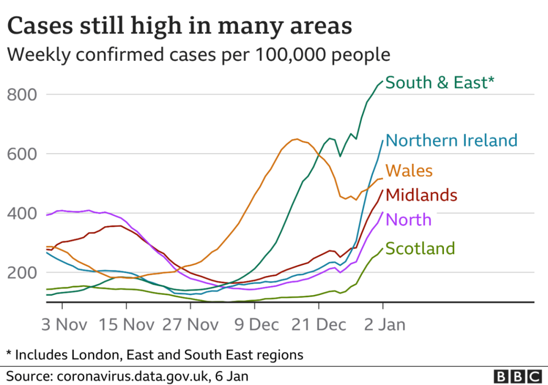 英国当地时间1月7日凌晨4点发布的最新数据显示,英国单日新增确诊5.2万例,新增死亡1162例。其中伦敦1万例,伯明翰1131例,利物浦854例,布里斯托428例,利兹418例,曼彻斯特354例,格拉斯哥353例,布莱顿霍夫318例,谢菲尔德308例。截止2021年1月3日,英国全国共有近130万人接种了1剂新冠疫苗,超2万人完成了2剂疫苗接种。上周,英国疫情感染高风险地区集中在首都伦敦、英格兰东南区(主要城镇包括布莱顿霍夫、吉尔福德、朴茨茅斯、米尔顿凯恩斯、雷丁、牛津、斯劳、南安普顿)、北爱尔兰(主要城镇贝尔法斯特)、威尔士(主要城镇卡迪夫)。目前英国所有地区均处于封锁中,所有中小学已经关闭。英格兰地区的封锁将于2月15日审核以确定是否解封,威尔士的学校最早在1月18日复学。苏格兰的封锁预计持续至少4周,北爱尔兰从12月26日开始了6周的封锁。除购买必要的食品、就医、无法在家进行的工作、运动等原因外,居民不得出门。外出锻炼每天只可以进行一次。由于英国正处于疫情封锁中,英国大学不建议学生现在到校开学,英国学生签证也做出了一系列更新。01