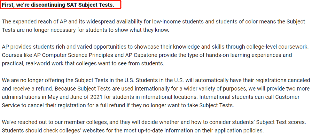 美国时间1月19日,College Board在宣布,取消SAT II (SAT Subject Test)以及SAT的写作部分。除了今年的最后两场考试,未来将不再提供。