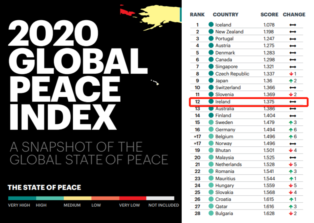 爱尔兰是世界公认的七大永久中立国之一,在“2020全球和平指数”排行榜中排在第12位,当之无愧的全球最和平国家的之一。