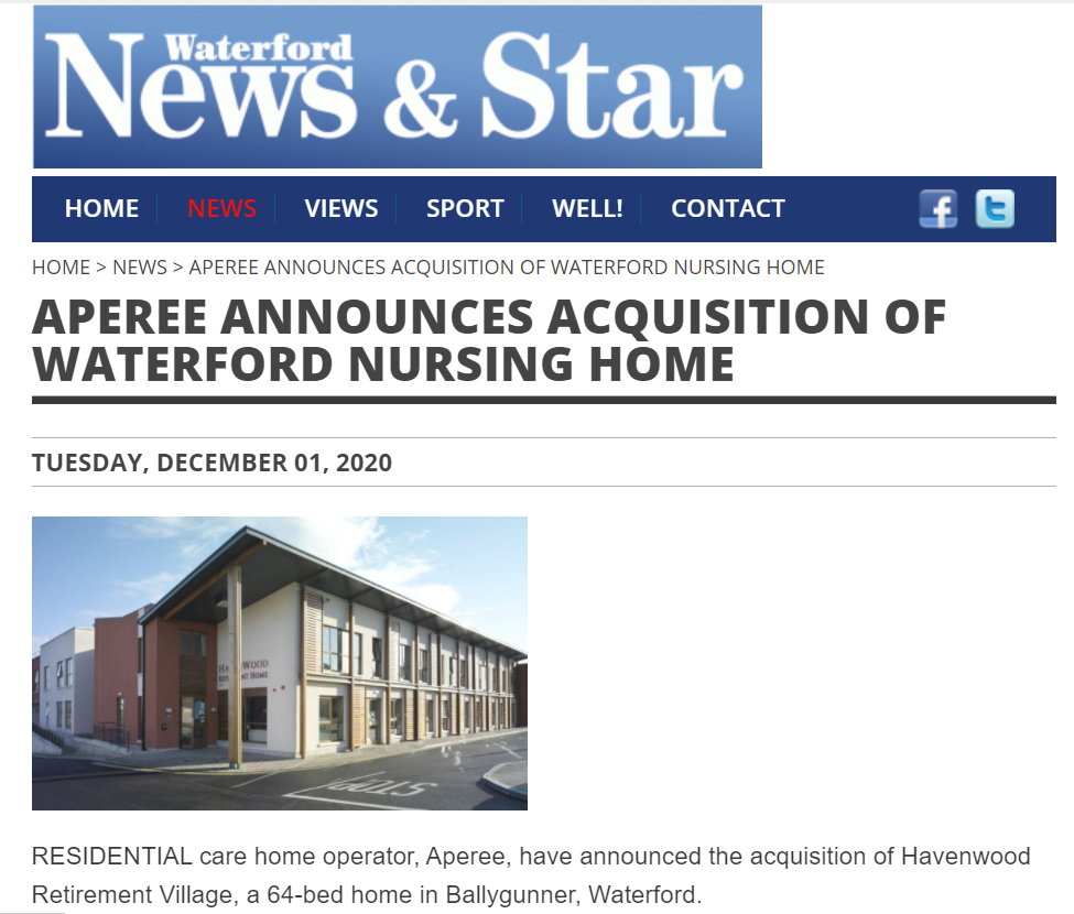 爱尔兰圣三一养老院集团及旗下6家养老院和1家康复中心整体出售给一家比利时公司。