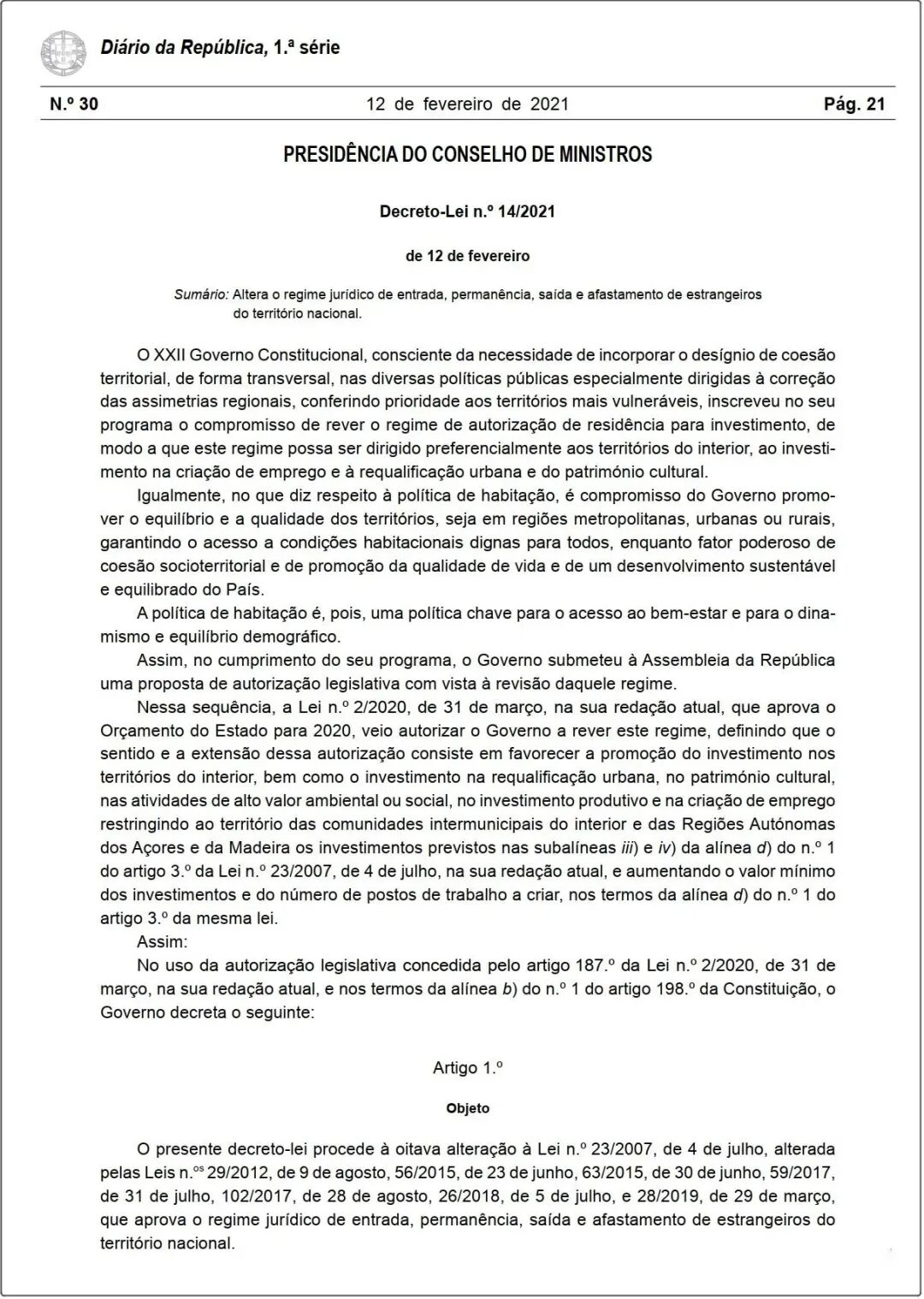 当地时间2月12日,葡萄牙政府发布了2021年第14法条,公布了2020年12月22日部长会议批准通过的黄金居留修正案将从2022年1月1日正式生效,明确了该国黄金签证倍受期待的新政细节,提高了基金投资门槛,缩小了购房移民的地理范围。