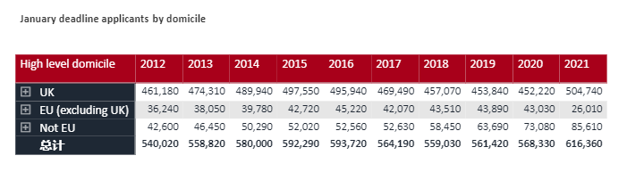 最近,英国大学招生服务中心UCAS公布了英国大学最新申请数据,数据显示,截止2021年1月,全球共有616360人通过UCAS系统递交了2021年英国本科入学申请,相较去年同期增长了8.45%。