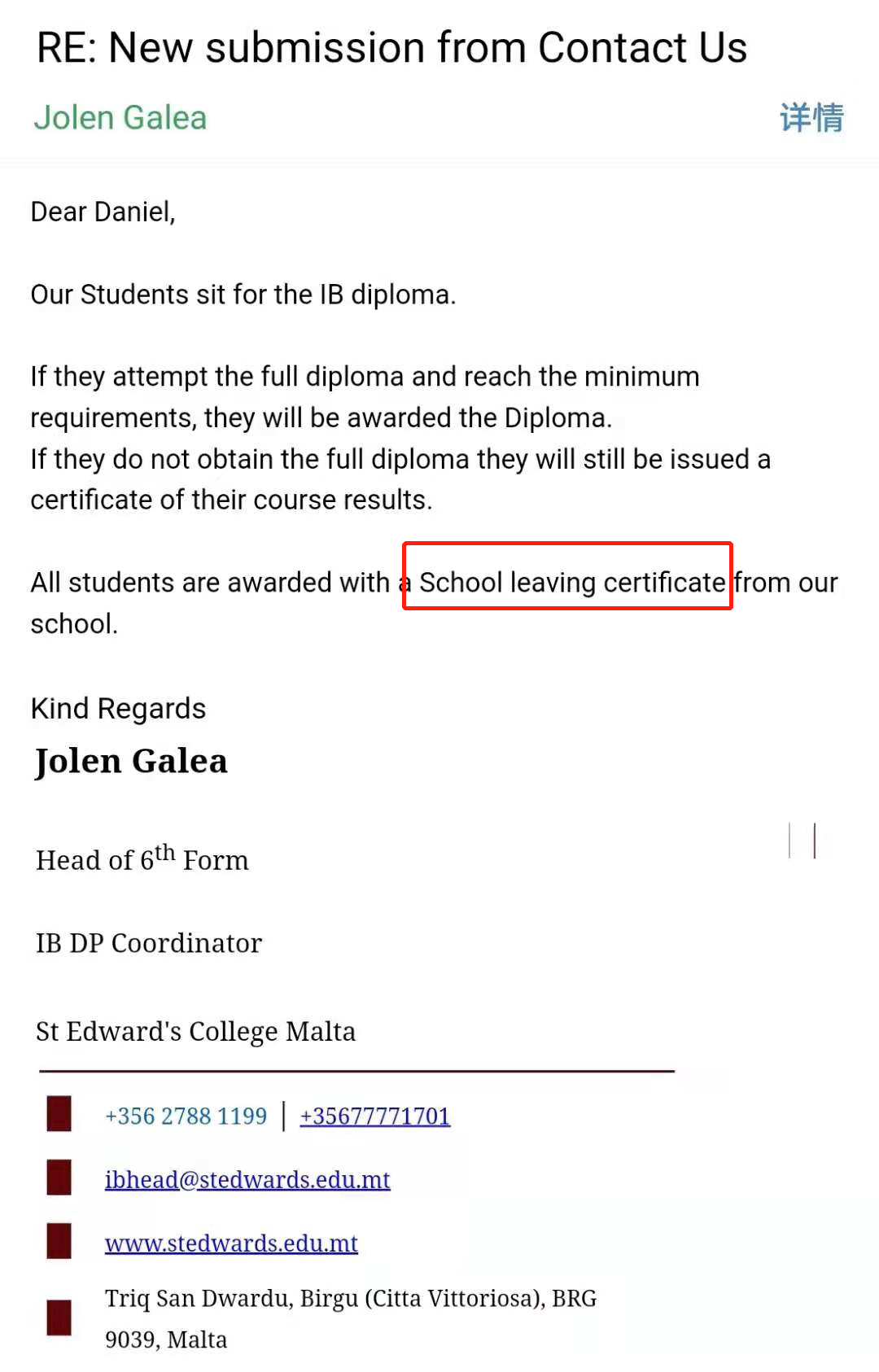 华侨生考试要求学生提供成绩单和毕业证,马耳他当地所有提供高中阶段课程的学校,学生毕业之后都可顺利拿到毕业证(leaving certificate/Diploma)。主要包括圣马丁、圣爱德华、Verdala和QSI以及公立学校的Junior College, Higher Secondary School。以下是马耳他当地verdala国际学校和圣爱德华国际学校回复的邮件。