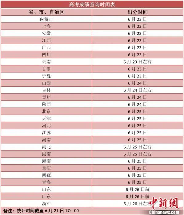6月23日开始,全国各地将陆续进入2021年高考“放榜”时间,根据各省份此前公布的时间来看,查分时间主要集中在23至26日。