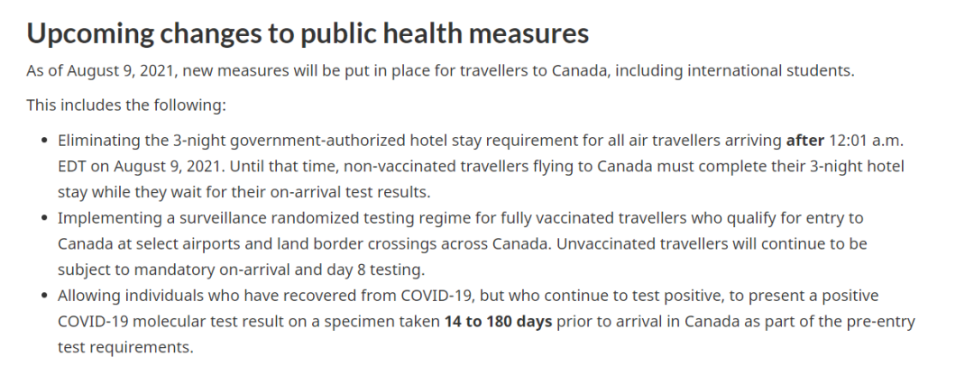 从加拿大东部时间8月9日 12:01 AM起,取消搭乘飞机入境旅客的3天政府强制酒店隔离政策,包括国际留学生在内。但是!目前所有搭乘飞机入境人士仍需要有必要理由,且必须在入境时提供隔离计划及做好入境后的隔离准备。