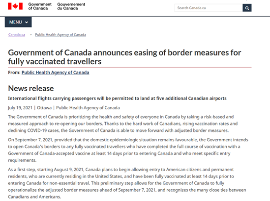 近期,加拿大政府宣布了多项疫情入境新的利好规定,从8月9日 12:01 AM起,允许完全接种加拿大认可的疫苗的美国公民和永久居民入境加拿大,无需隔离14天。并且计划从9月7日开始,其他国家已经接种加拿大认可疫苗的旅客入境也无需隔离。