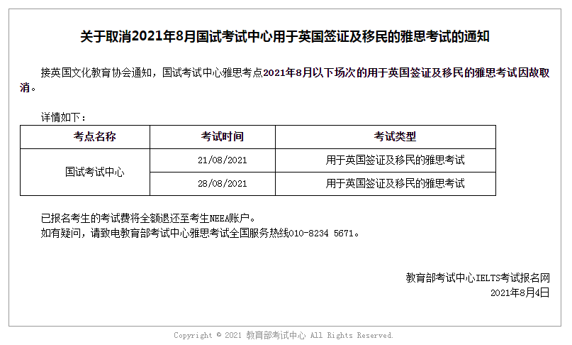 接英国文化教育协会通知,国试考试中心雅思考点2021年8月以下场次的用于英国签证及移民的雅思考试因故取消。