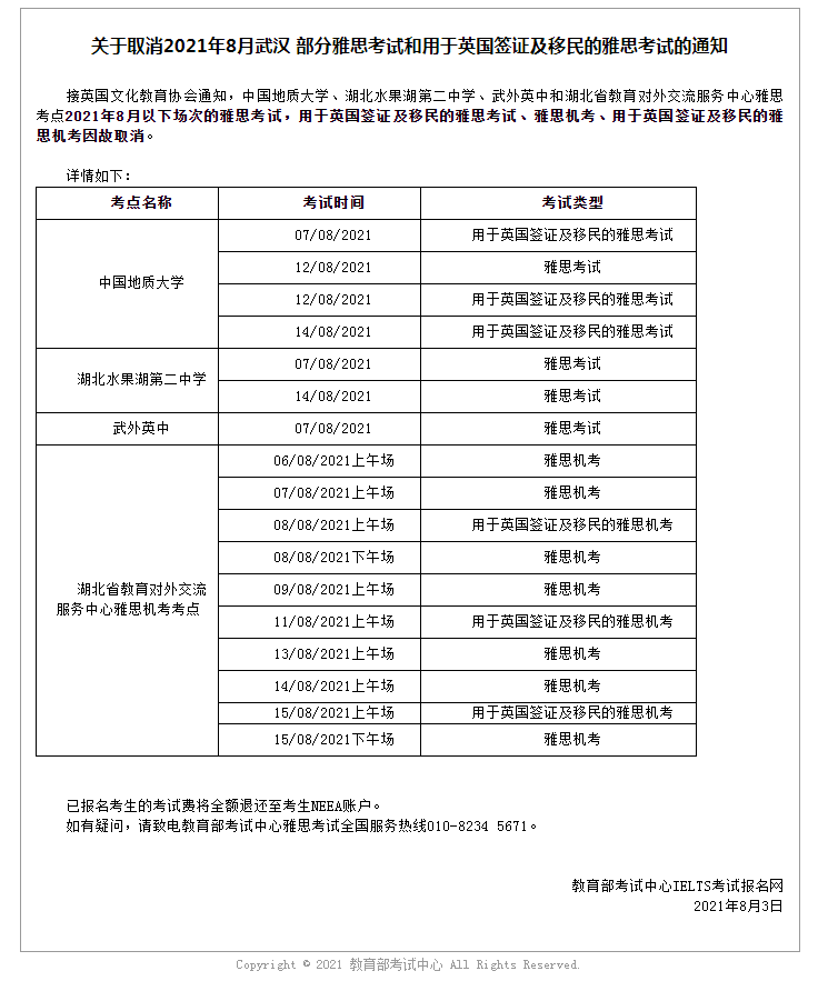接英国文化教育协会通知,中国地质大学、湖北水果湖第二中学、武外英中和湖北省教育对外交流服务中心雅思考点2021年8月以下场次的雅思考试,用于英国签证及移民的雅思考试、雅思机考、用于英国签证及移民的雅思机考因故取消。