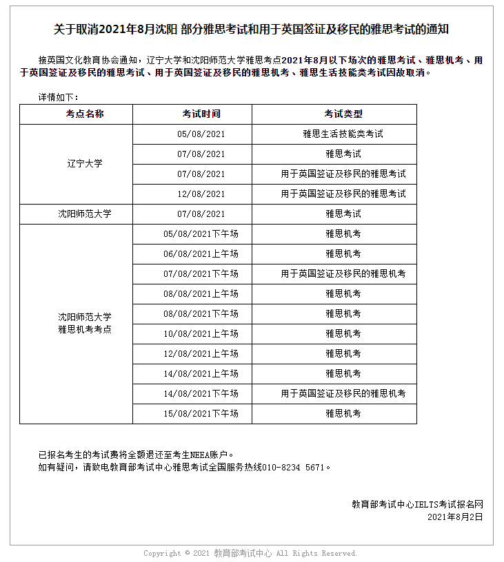 接英国文化教育协会通知,辽宁大学和沈阳师范大学雅思考点2021年8月以下场次的雅思考试、雅思机考、用于英国签证及移民的雅思考试、用于英国签证及移民的雅思机考、雅思生活技能类考试因故取消。
