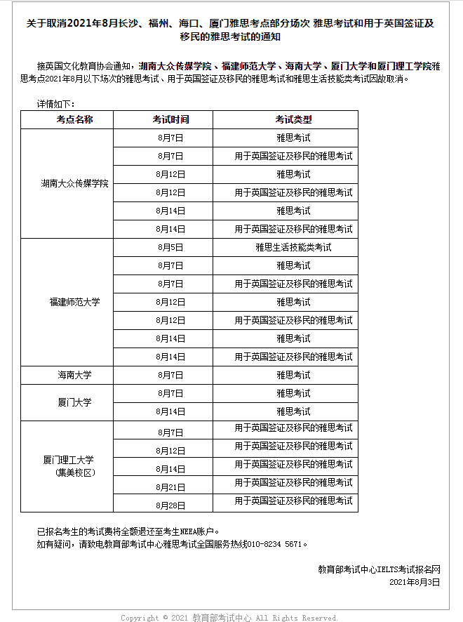 接英国文化教育协会通知,湖南大众传媒学院、福建师范大学、海南大学、厦门大学和厦门理工学院雅思考点2021年8月以下场次的雅思考试、用于英国签证及移民的雅思考试和雅思生活技能类考试因故取消。