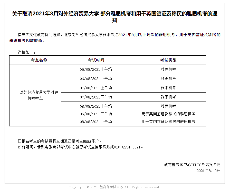 接英国文化教育协会通知,北京对外经济贸易大学雅思考点2021年8月以下场次的雅思机考、用于英国签证及移民的雅思机考因故取消。