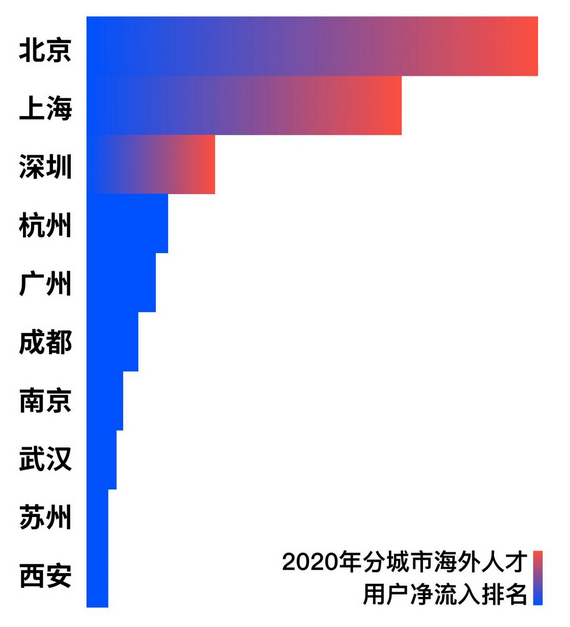 近年来,各地为了吸引人才纷纷抛出橄榄枝,“抢人”大战也日趋激烈。《脉脉数据研究院:中国职场流动趋势年度报告2021》数据显示,北京、上海、深圳等一线城市对海归人才的吸引力明显高于其他城市。