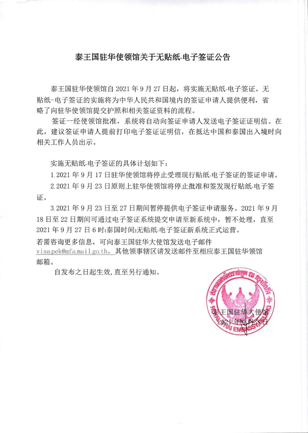 据泰王国驻华使领馆最新发布消息:自2021年9月27日起将实施无贴纸-电子签证。