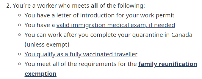 加拿大工签(开放或封闭式)持有人的直系亲属即使没有接种加拿大认可疫苗,也可以随行或单独入境加拿大。