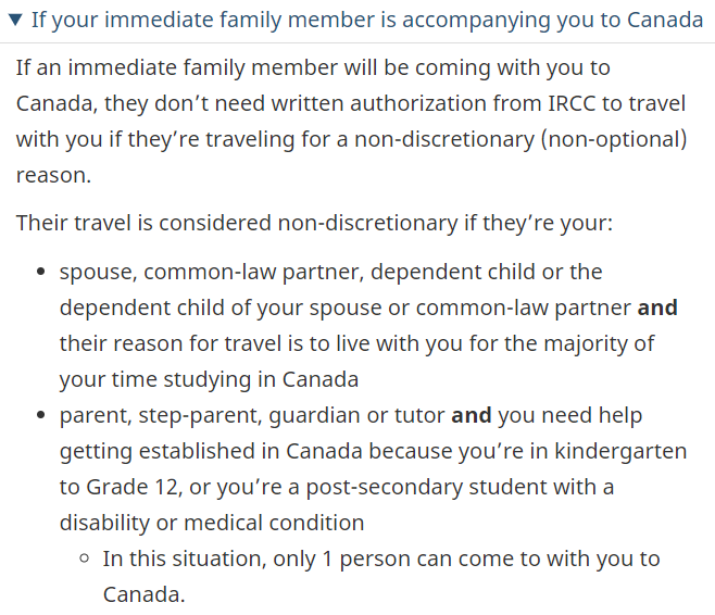 如果直系亲属将与留学生一起前往加拿大,并且他们出于必要旅行原因,则无需IRCC的书面授权也可以一起入境加拿大。