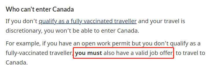 但同时移民部还在同一页给出了一种无法入境加拿大的工签情况:如果没有接种加拿大认可疫苗,且旅行被认定为非必要旅行,依然无法进入加拿大。移民局给出的示例是:如果你持有开放式工作签证,且没有接种加拿大认可疫苗,那么你必须要有一份有效的Job offer才能进入加拿大。因此,持有开放式工签,且没有把握向边境官员证明你是加拿大常住临时居民(如有租房协议、车贷房贷等等材料),在入境加拿大前最好能够拥有一份有效工作offer。