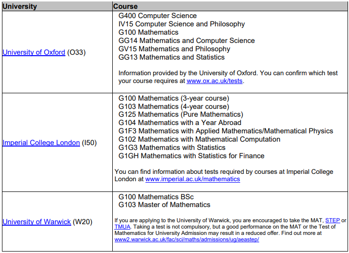 申请牛津、帝国理工以下课程,需要参加MAT考试;申请华威大学以下课程,鼓励参加MAT考试。