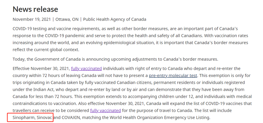 加拿大时间11月19日,加拿大联邦政府召开新闻发布会,宣布将扩大认可疫苗清单,中国研制的国药(Sinopharm)和科兴(Sinovac)疫苗,也在这份清单中。这意味着,从11月30日开始,来自中国的旅客,只要在入境前14天打完国药、科兴疫苗,就可以直接入境加拿大!