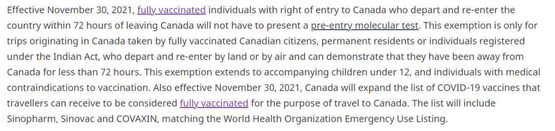 加拿大联邦政府还在发布会中宣布修改了边境检测规则,方便人们短途旅行。从11月30日开始,出国旅行时间少于72小时,且完全接种了Covid-19的加拿大人在返回加拿大时无需出示PCR核酸检测报告!免PRC核酸检测的适用人群是完全接种疫苗的加拿大公民、永久居民以及原住民