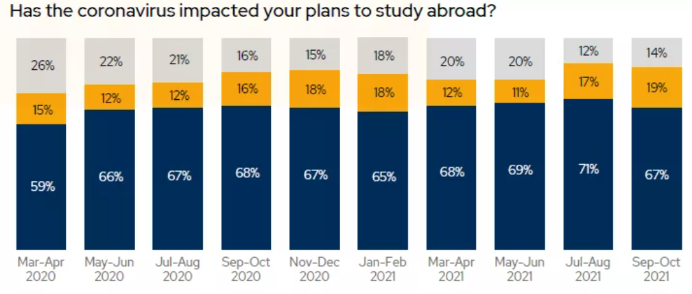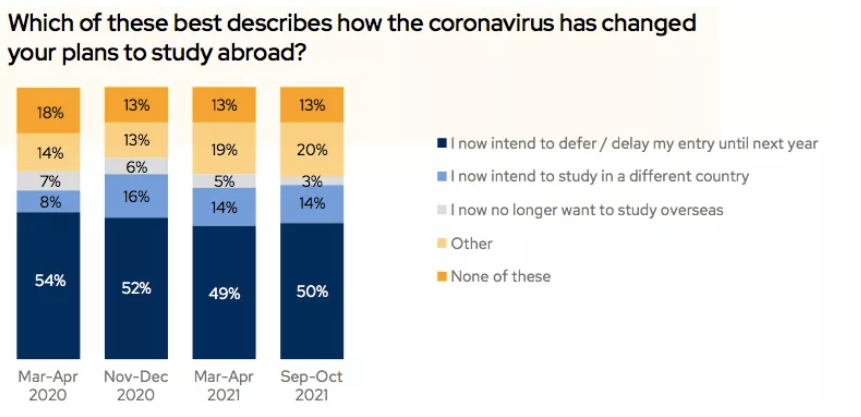 不过,即使选择改变留学目的地的学生比例很低,但确实略有增加,从2020年3-4月的8%到2020年底达到16%,直至2021年底稳定在14%左右。