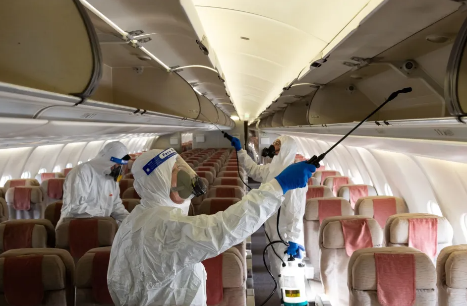 正在给机舱消毒的工作人员