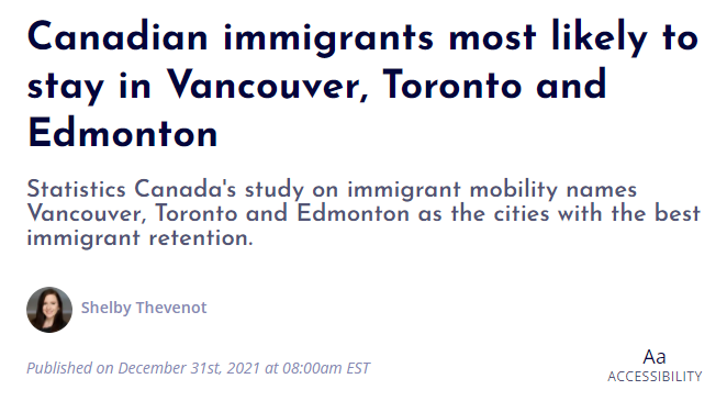 研究新移民喜欢居住的地方对于制定吸引新移民到特定地区的政策很重要。通过流动性数据,我们了解移民认为什么样的地方有吸引力,以及哪些因素会影响他们决定留下还是离开。加拿大统计局最近发表了一项关于移民在哪些城市和省份停留时间最长的研究。研究人员使用了 2020 年纵向移民数据库(IMDB)中的税务文件数据,该数据库通常用于跟踪加拿大移民的经济情况。他们主要调查了 2014 年来到加拿大的移民。在城市层面,2014 年移居温哥华的移民在五年后的保留率最高,略高于 86%。换句话说,如果 2014 年有 100 人搬到温哥华,那么其中 86 人在 2019 年仍在该市报税。多伦多的保留率位居第二,五年后大约有 86% 的人留在了该市。埃德蒙顿以近 85% 的比例位居第三。在加拿大大西洋地区,哈利法克斯的保留率最高,接近 58%。大西洋加拿大地区历来保留率较低。省级层面,新斯科舍省在该地区的保留率最高,接近 63%。在加拿大工作或学习的经历会影响移民在不同地区之间移动的决定。就业似乎是留住人才的关键因素。在2014年成为永久居民的移民中,有工作经验的人更多地留在了他们被录取的省或地区。有工作经验的难民最有可能留在他们的接纳省份,保留率为 93%。那些在成为永久居民之前只有工作许可的人的保留率略高于 90%。有工作和学习经验的新移民保留率约为81%。在获得永久居留权之前只有学习许可的移民的保留率最低,约为 79%。学生可能会更频繁地搬家寻找工作,但这项研究并未关注移民决定搬迁背后的具体原因。