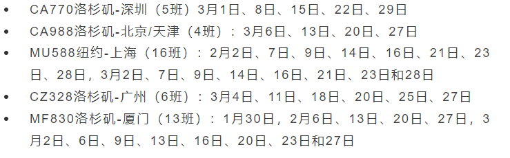 首趟被停飞的将是厦航1月30日由洛杉矶飞往厦门的航班。大多数被停飞的航班是从洛杉矶出发的,其余航班从纽约出发,时间从1月底到3月底。
