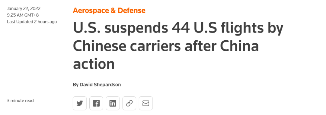 针对中国近期因疫情输入熔断大量入境航班的措施,美国提出“反制”。当地时间1月21日,美国政府突然宣布,将取消44班次由中国的航空公司运营的美国赴华航班。