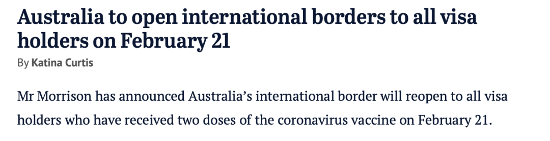 澳洲国际边界将从2月21日起向所有完全接种疫苗的签证持有人重新开放。莫里森表示:“国家内阁今天决定,澳大利亚将在今年2月21日向所有剩余签证持有者重新开放边境。”