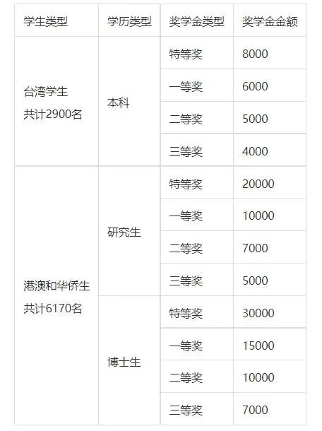 根据财政部和教育部2017年下发的《港澳及华侨学生奖学金管理办法》 的相关规定,为欢迎更多的香港、澳门、台湾地区学生和华侨学生来内地(祖国大陆)学习,针对他们设立专门的奖学金,名额总计9070名,获奖学生比例不低于30%。