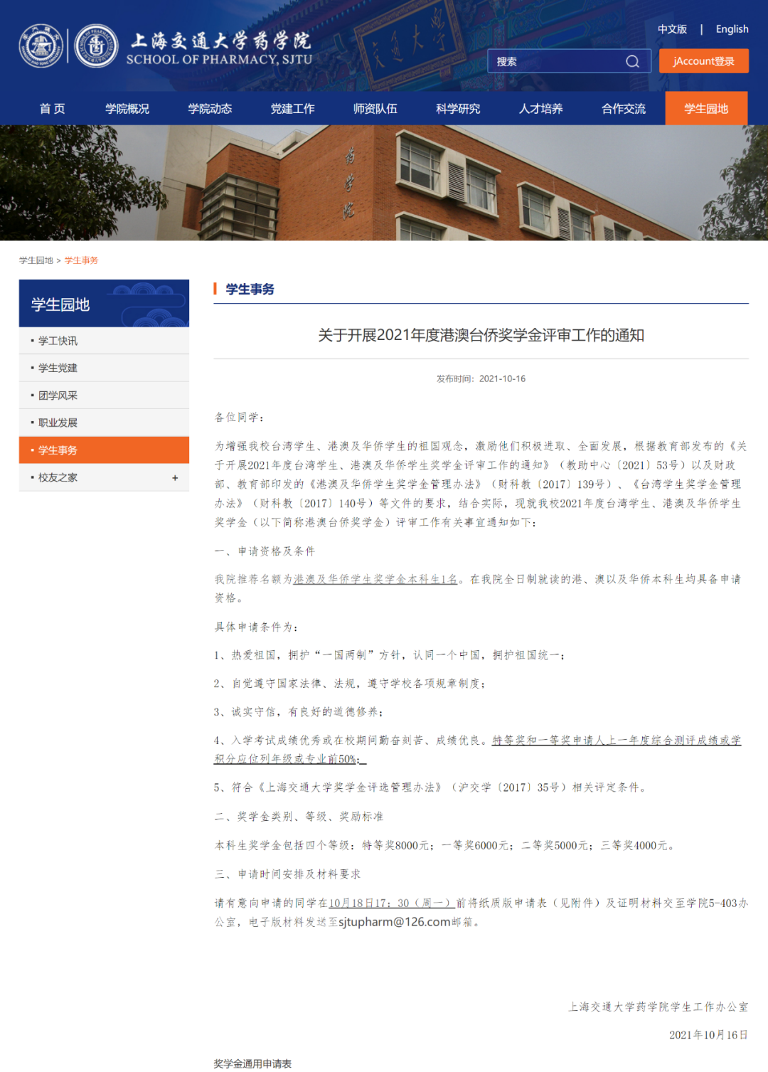 上海交通大学发布的关于2021年港澳台及华侨学生奖学金评审工作的通知