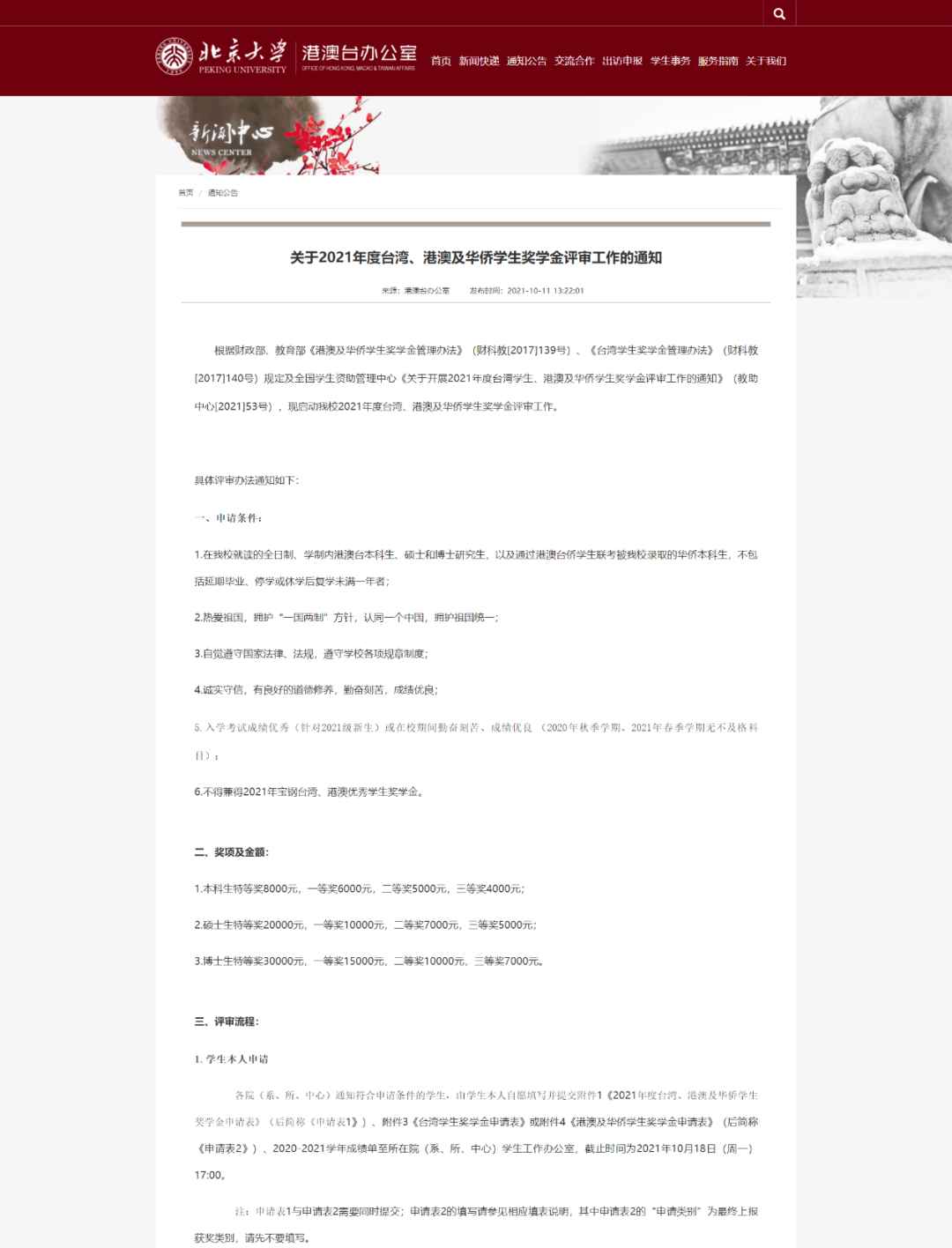 下图为北京大学2021年发布的关于港澳台及华侨学生奖学金评审工作的通知、申请条件、奖项及金额和评审流程