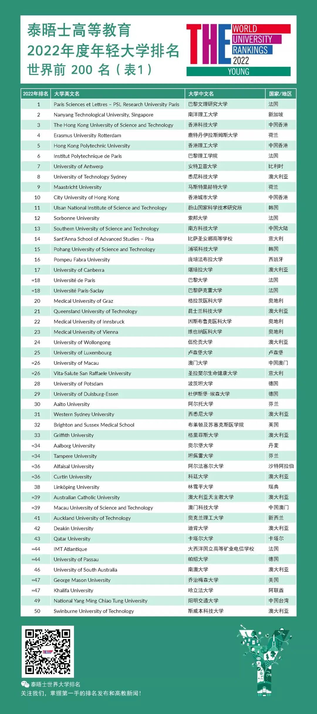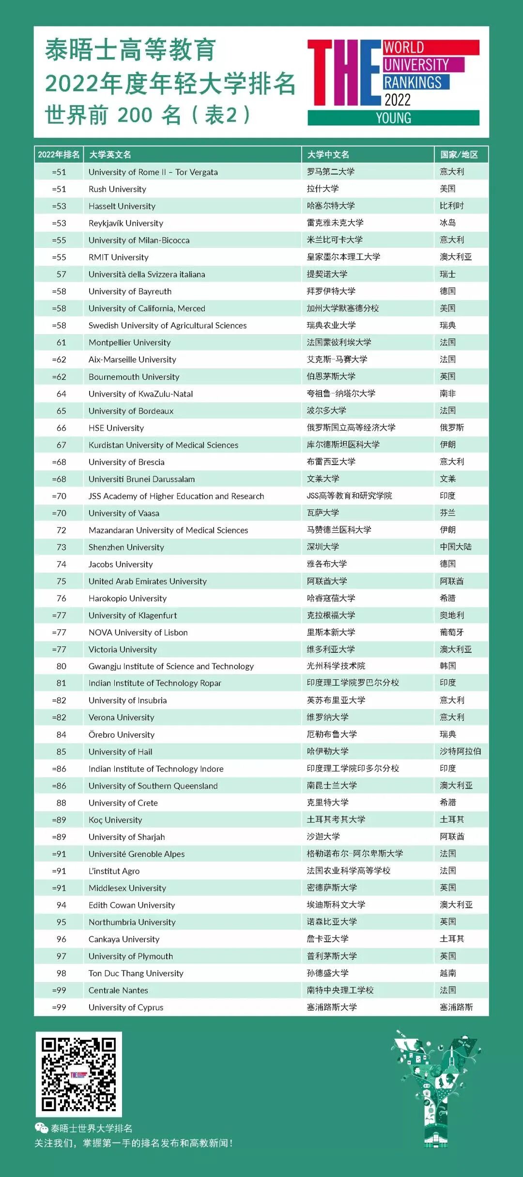 泰晤士高等教育于2022年2月15日北京时间下午6点发布了2022年度年轻大学排名。这份排名仅关注成立50年或以下的高校(包括于1972年至今建校的高校)。